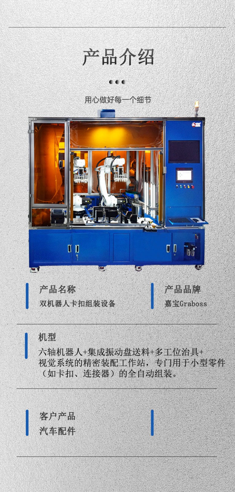 振动盘将待组装卡扣输送至指定位置,视觉系统拍照,识别零件位置与角度,机器人根据指令,通过末端的定制化夹具抓取卡扣,完成插入、压合、锁付等装配动作,装配完成后可进行在位检测。